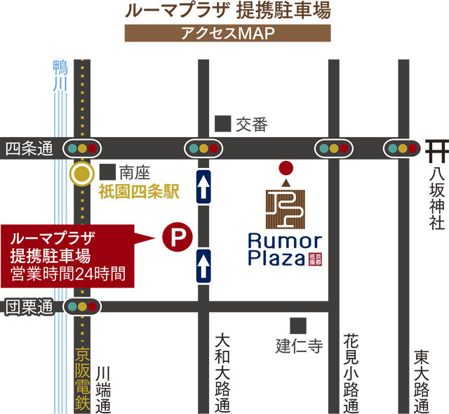 - [京阪電鉄]京阪本線「祇園四条駅」6番出口より東へ徒歩4分(約200m)